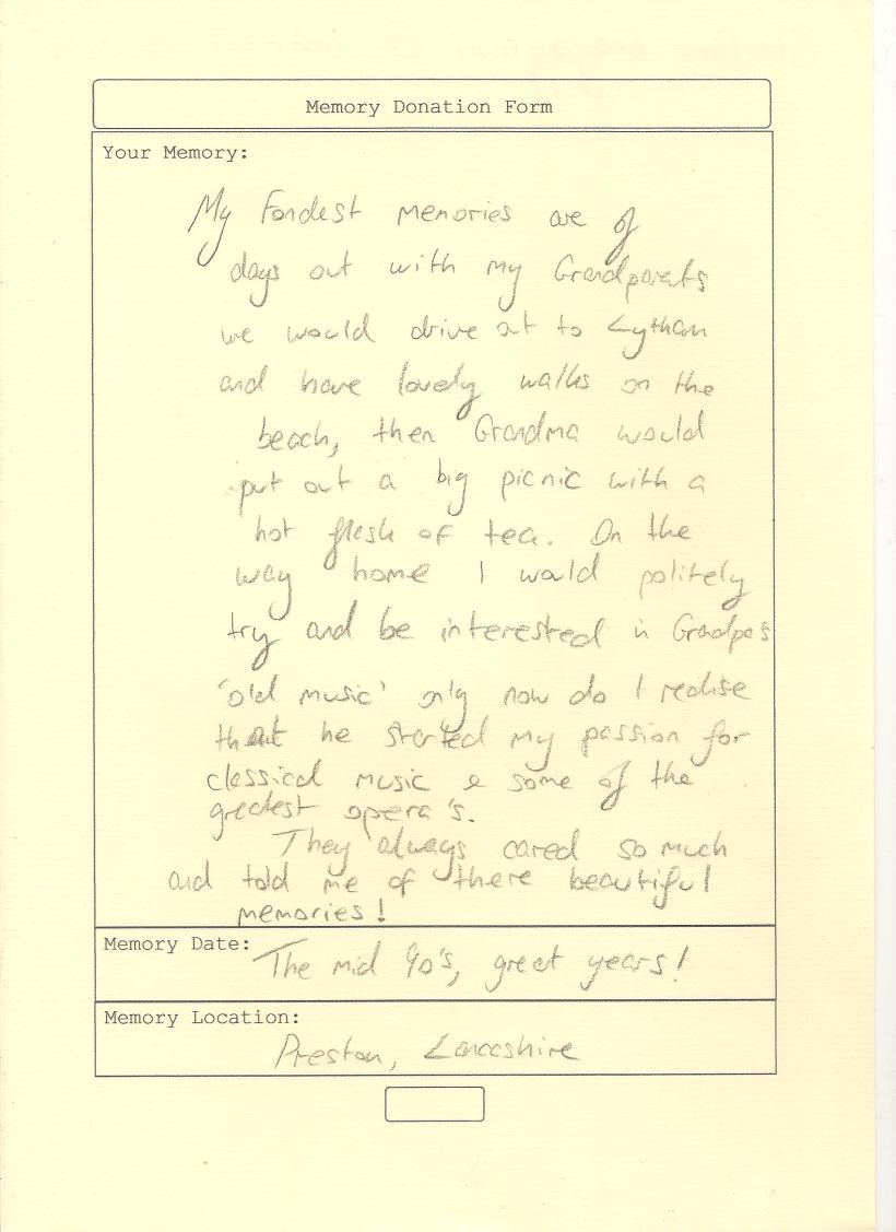 They took me out on my own for the day. I sat in the back of their old red car and we sang along to old music on our way to the coast. We had a great time and built a huge sandcastle. As the tide came in we collected stones and stood on the sea wall dropping them onto our creation.