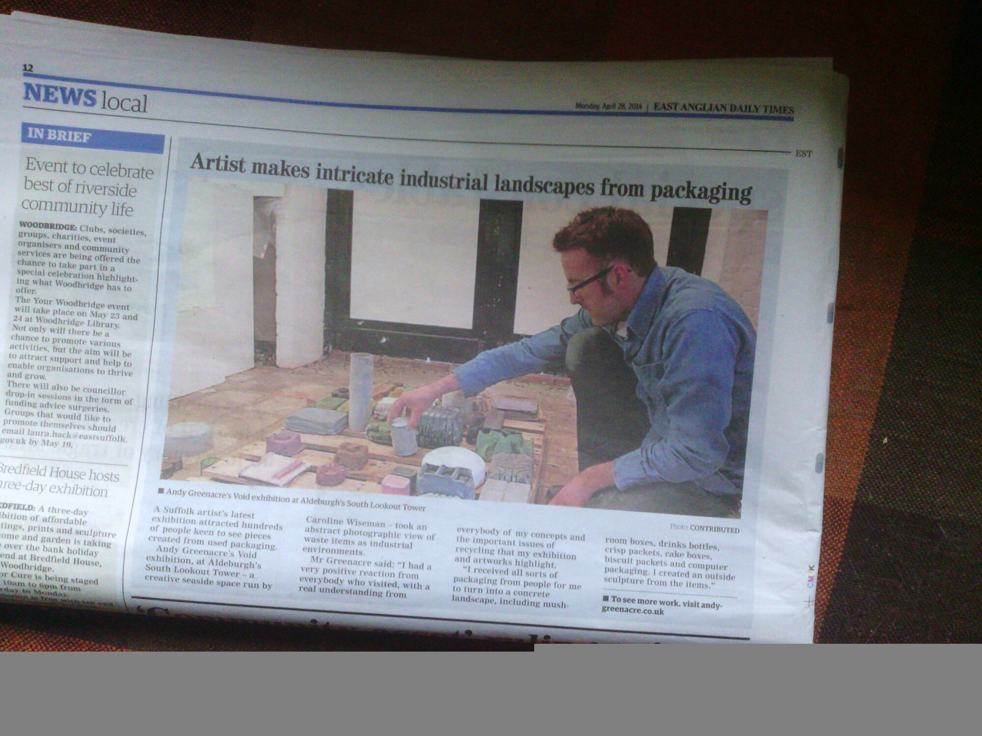 Great news from my neighbour just 10 minutes ago, my exhibition ‘Void’ that took place over the Easter weekend in Aldeburgh is in the local newspaper. My neighbour has kindly given me her copy. I had to retrieve it from under her sleeping cat so any ideas of fame and fortune have been put in their place ;)