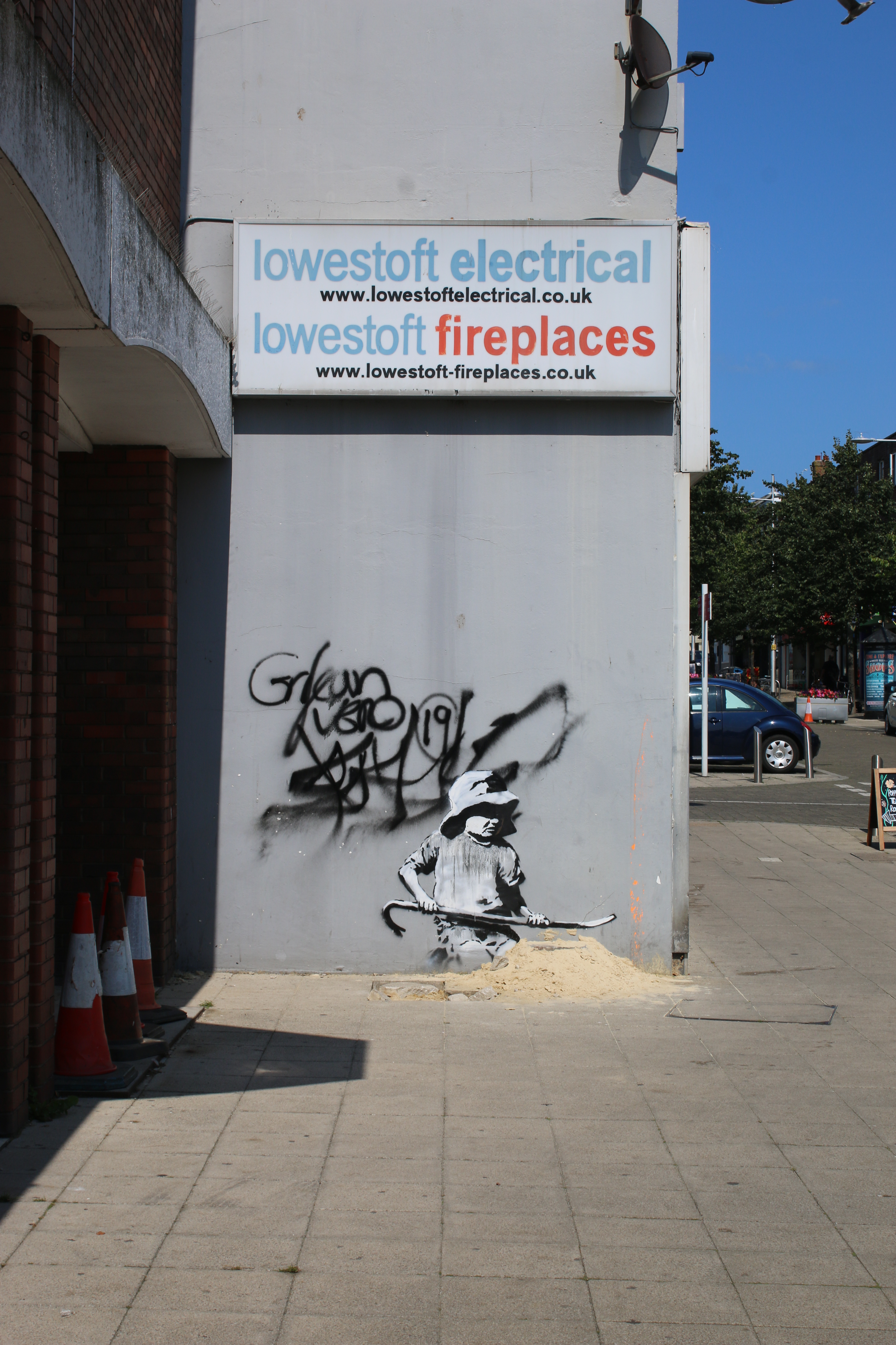 Within days of their emergence, one of the Lowestoft Bansky artworks was lost (maybe temporarily, time will tell) when it was vandalised with paint. A second artwork in Gorleston was removed by the authorities because of the delicate and sensitive nature of its location. But arguably the most prominent and easiest Banksy for people to see was the spray-painted image of a girl holding a crowbar that appeared on an empty shop in Lowestoft overnight in early August. Now this has been lost to commercialism..