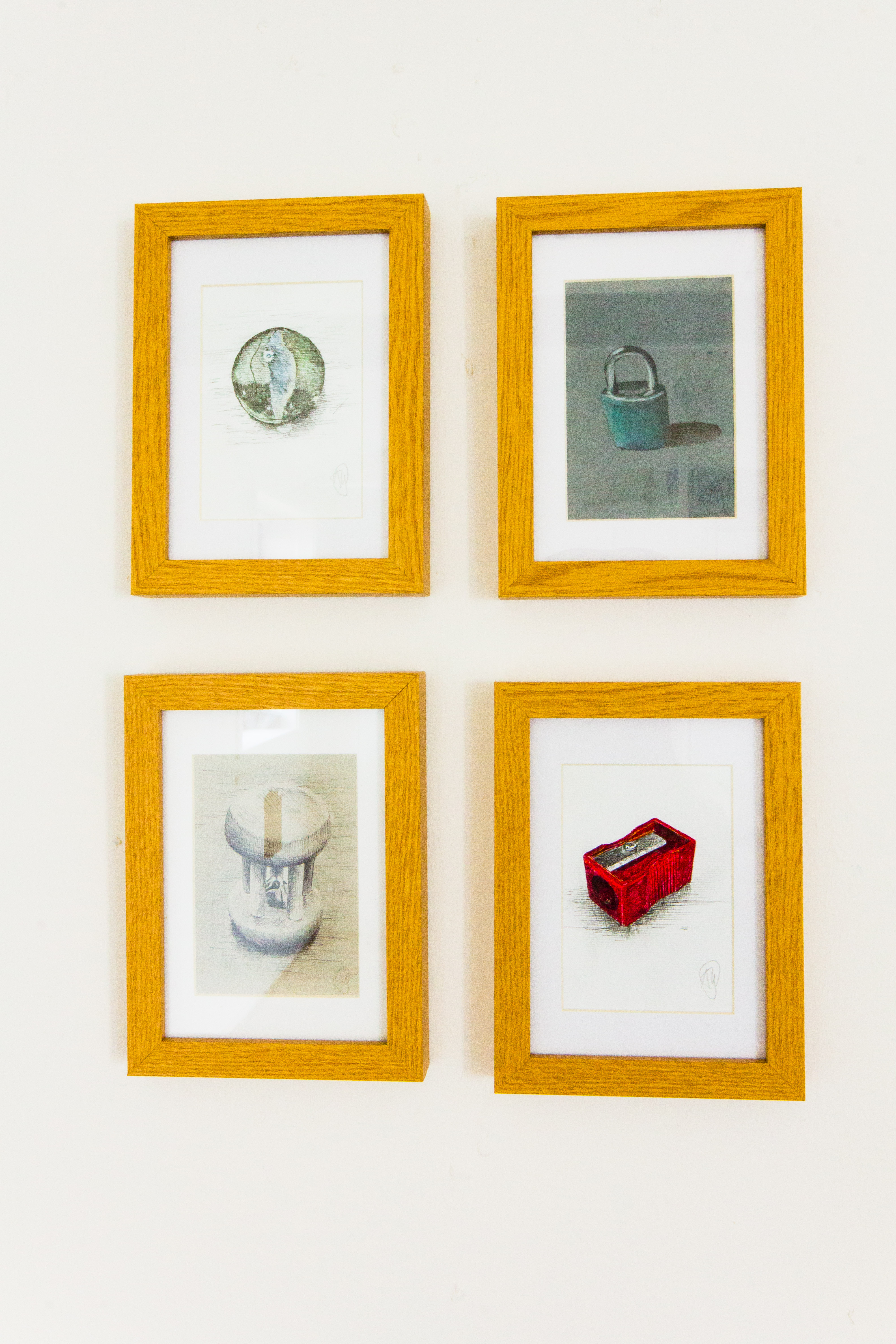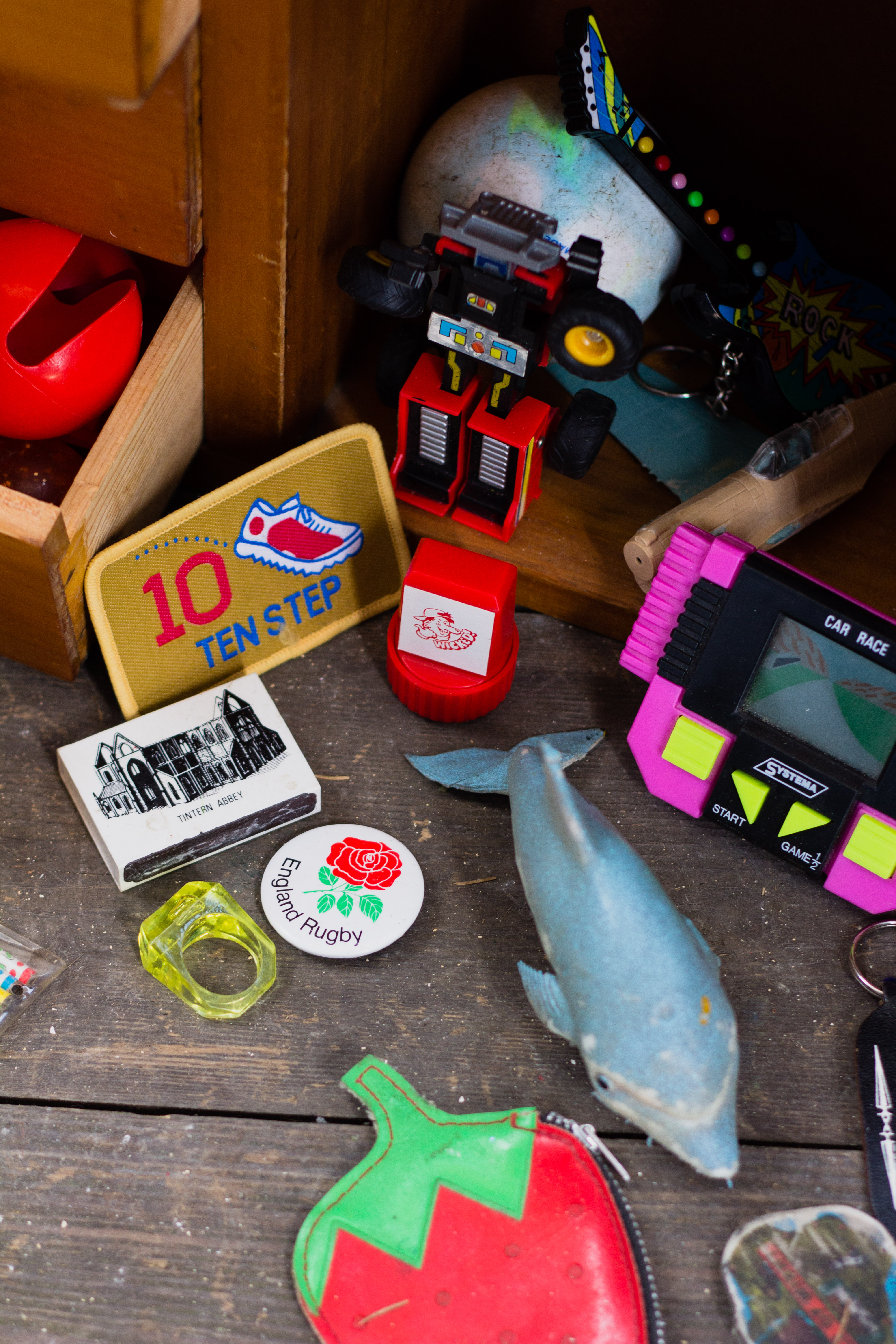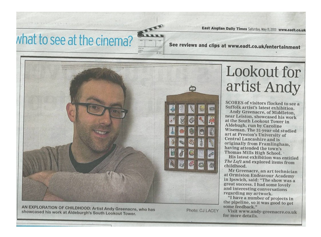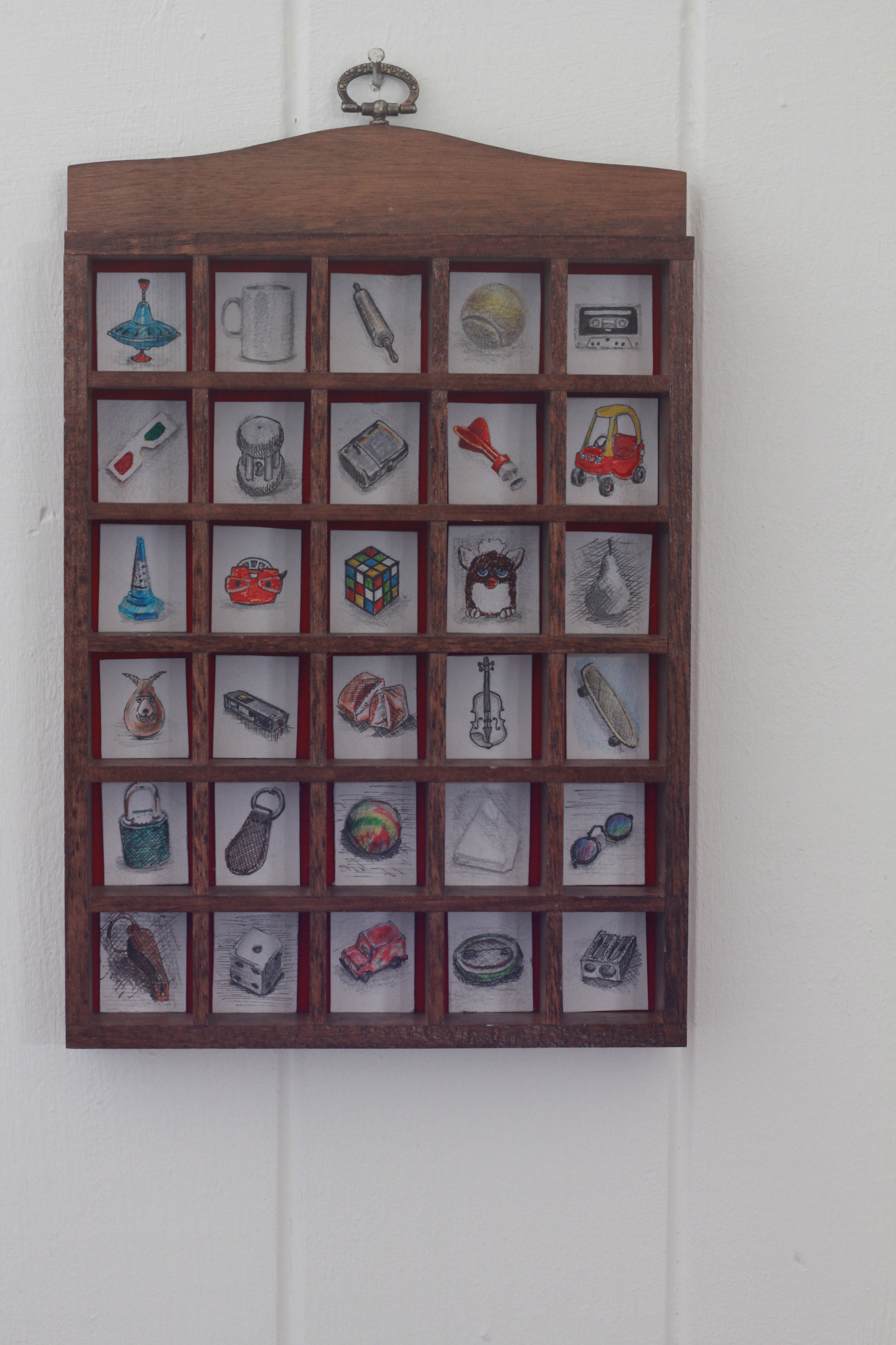 The Loft exhibition took place on the bank holiday weekend in May 2013 in the South Lookout Tower on Aldeburgh beach. This was the first of two exhibitions held in this inspiring coastal venue and explored the reasons we keep or discard our belongings. The room at the top of the tower was filled with childhood collections of retro toys, pin badges, Panini stickers, Kellogg’s freebies, phone-cards and much more. Visitors were welcomed into the loft space and asked the question ‘What’s in your loft?’. The accompanying exhibition featured fine pencil and ink drawings of childhood toys alongside a display of miniature thimble-sized artworks.