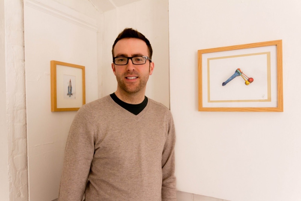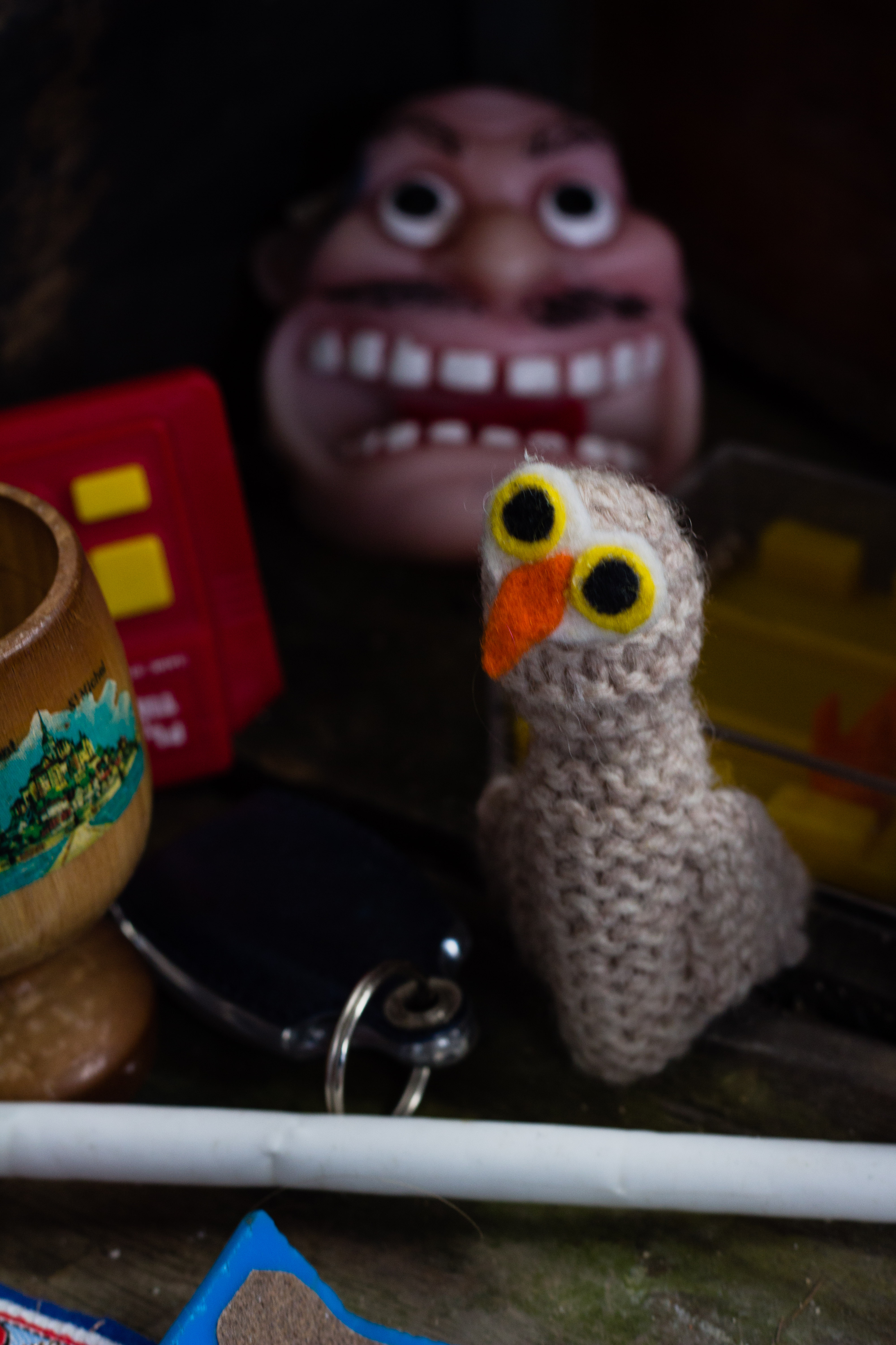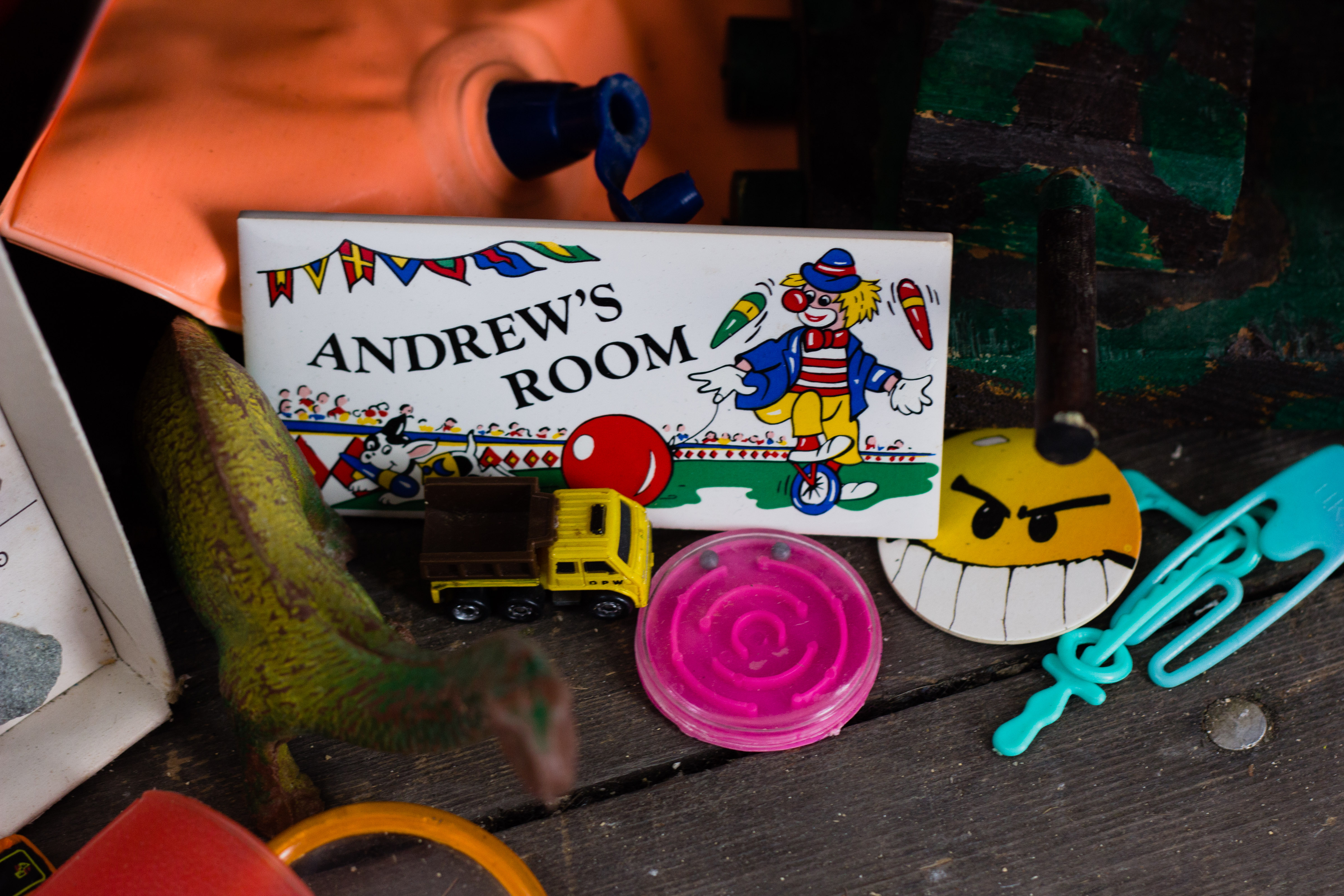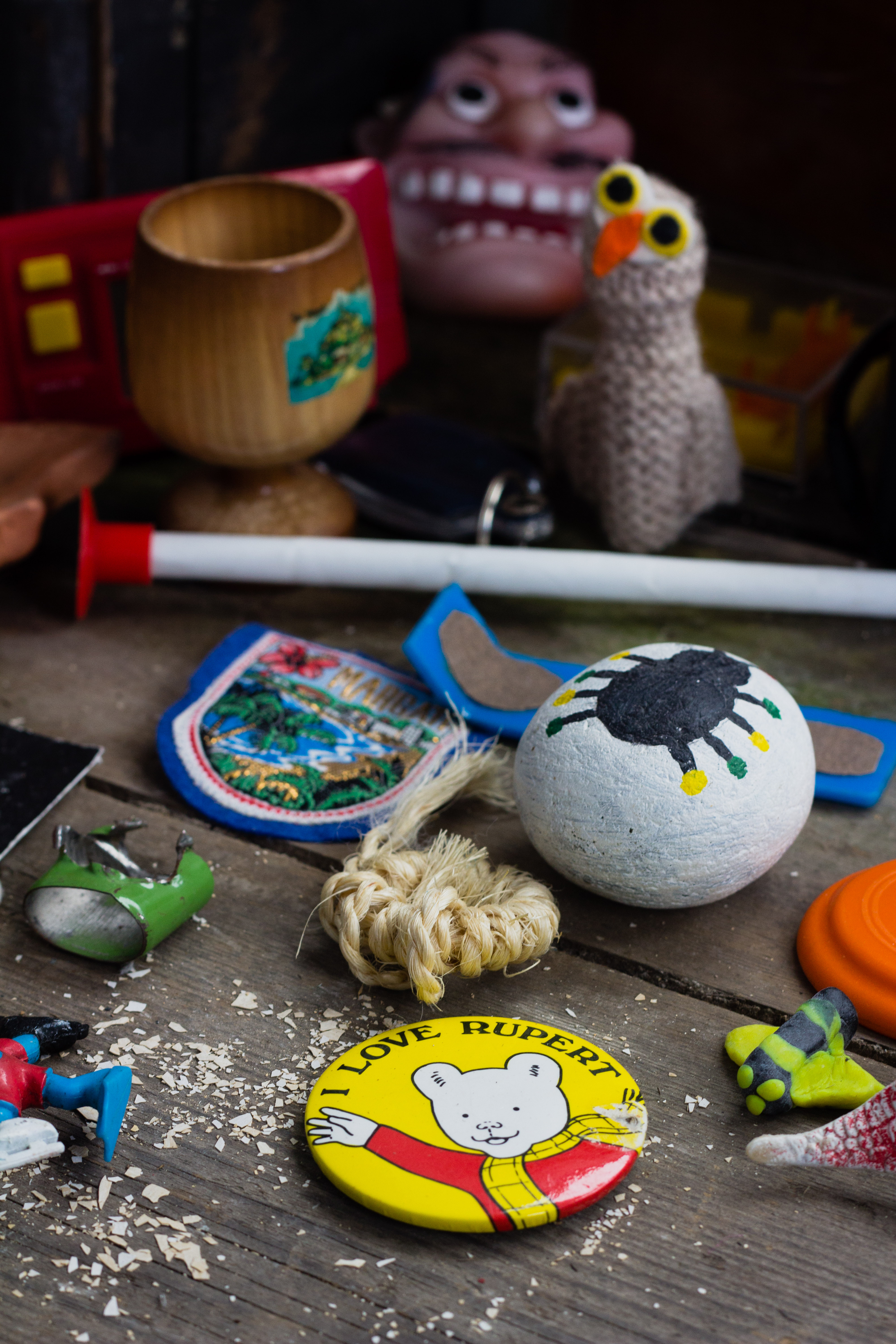 The Loft exhibition took place on the bank holiday weekend in May 2013 in the South Lookout Tower on Aldeburgh beach. This was the first of two exhibitions held in this inspiring coastal venue and explored the reasons we keep or discard our belongings. The room at the top of the tower was filled with childhood collections of retro toys, pin badges, Panini stickers, Kellogg’s freebies, phone-cards and much more. Visitors were welcomed into the loft space and asked the question ‘What’s in your loft?’. The accompanying exhibition featured fine pencil and ink drawings of childhood toys alongside a display of miniature thimble-sized artworks.